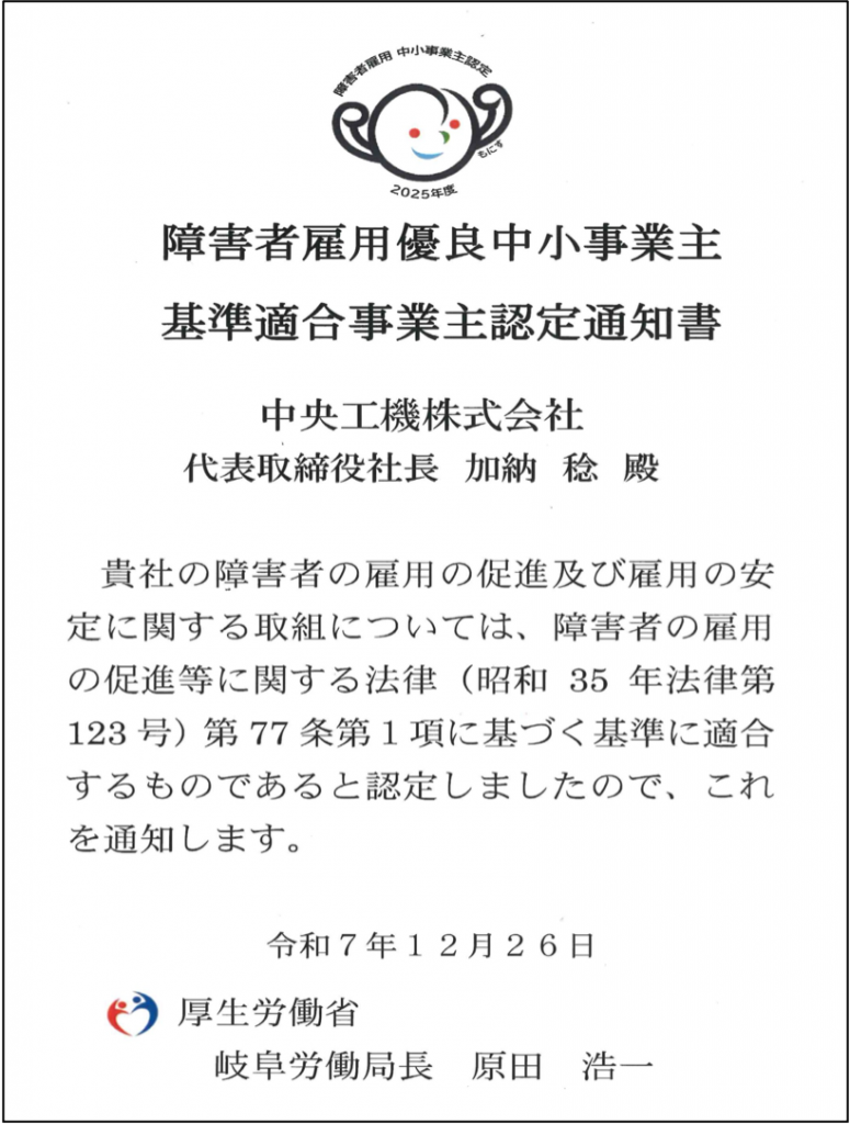 中央工機株式会社は、2026年1月29日、厚生労働省より「もにす認定」を受けました。